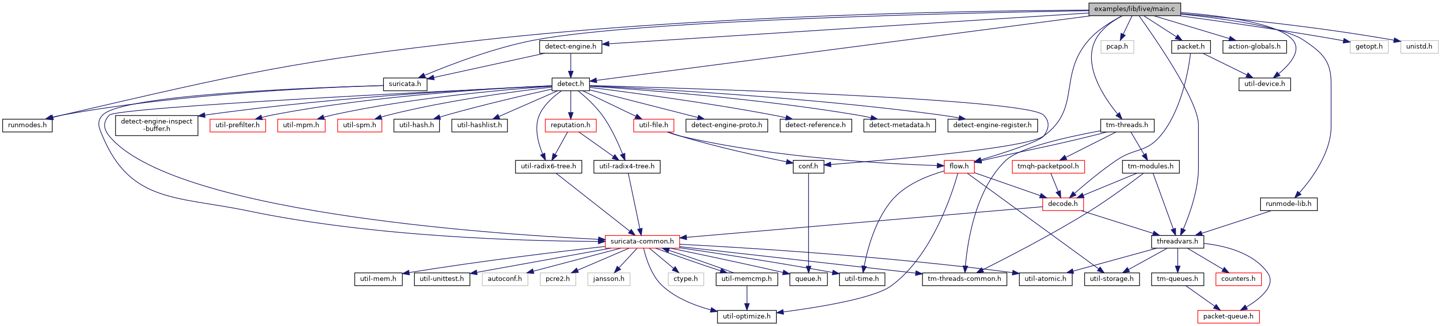 #include "suricata.h"#include "detect.h"#include "detect-engine.h"#include "runmodes.h"#include "conf.h"#include "pcap.h"#include "runmode-lib.h"#include "tm-threads.h"#include "threadvars.h"#include "action-globals.h"#include "packet.h"#include "util-device.h"#include <getopt.h>#include <unistd.h>